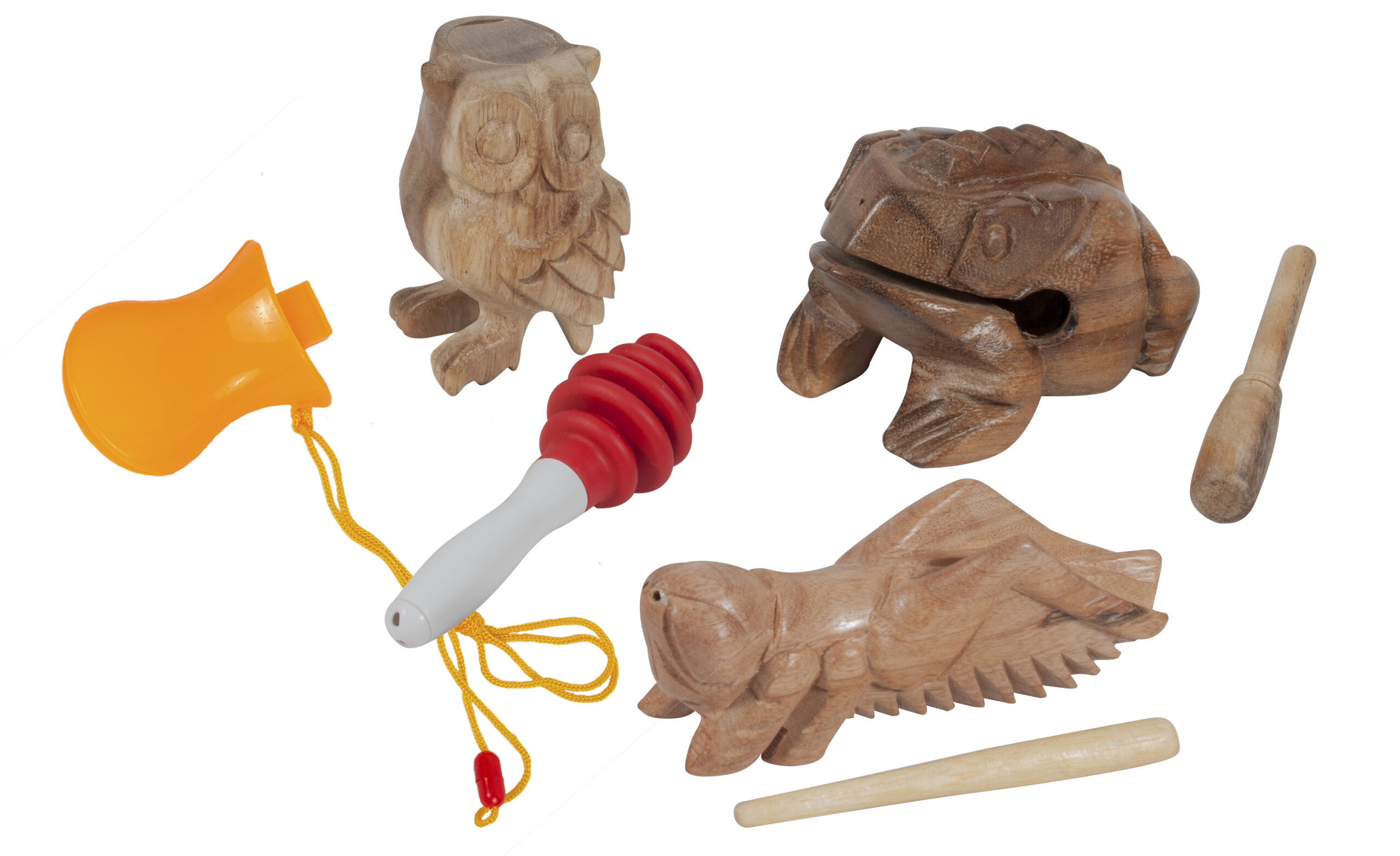 This kit contains five wood, plastic and latex instruments that mimic animal sounds. Help teach children about animal sounds, or use them to add awesome sound effects to stories and skits. Includes storage tote and instructional DVD.