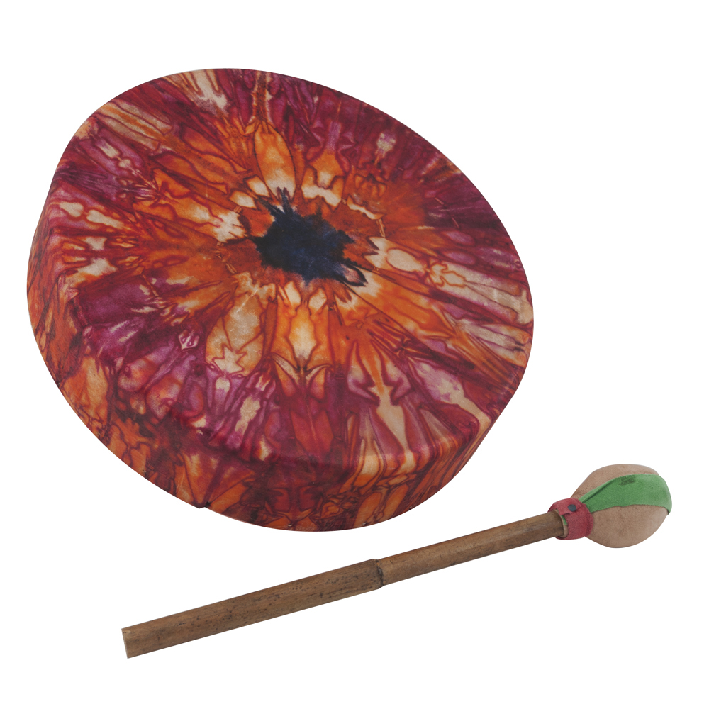 This 12″ Buffalo Drum has a beautiful natural skin tie dye head. The wood frame and the leather wrapped handle make this a favorite. Based off a traditional Native American model, this drum can produce a wide variety of sounds and effects. Colors may vary. Includes a cloth covered beater.