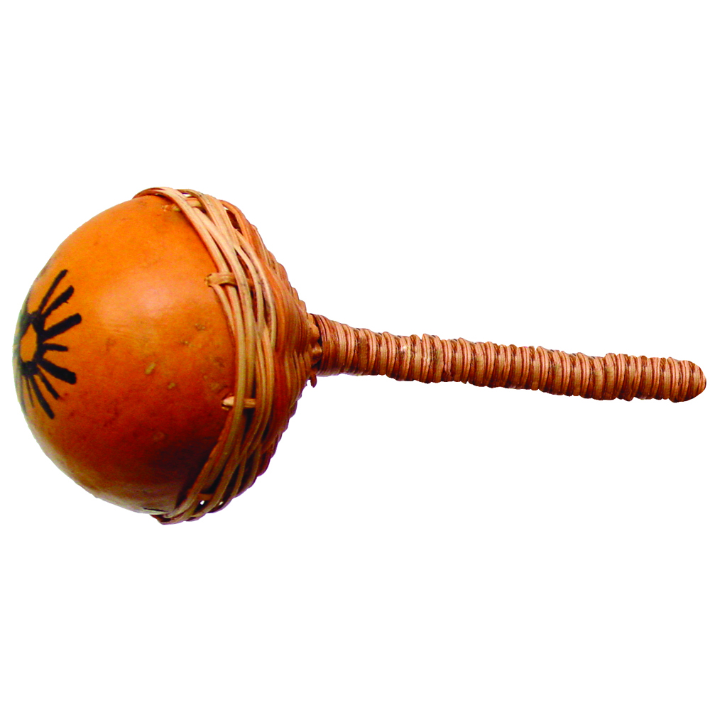 This African instrument is created from woven strips of cane and pieces of calabash with pebbles inside, the calabash rattle produces a bell-like sound. Shake or tap against your hand to create various sounds.