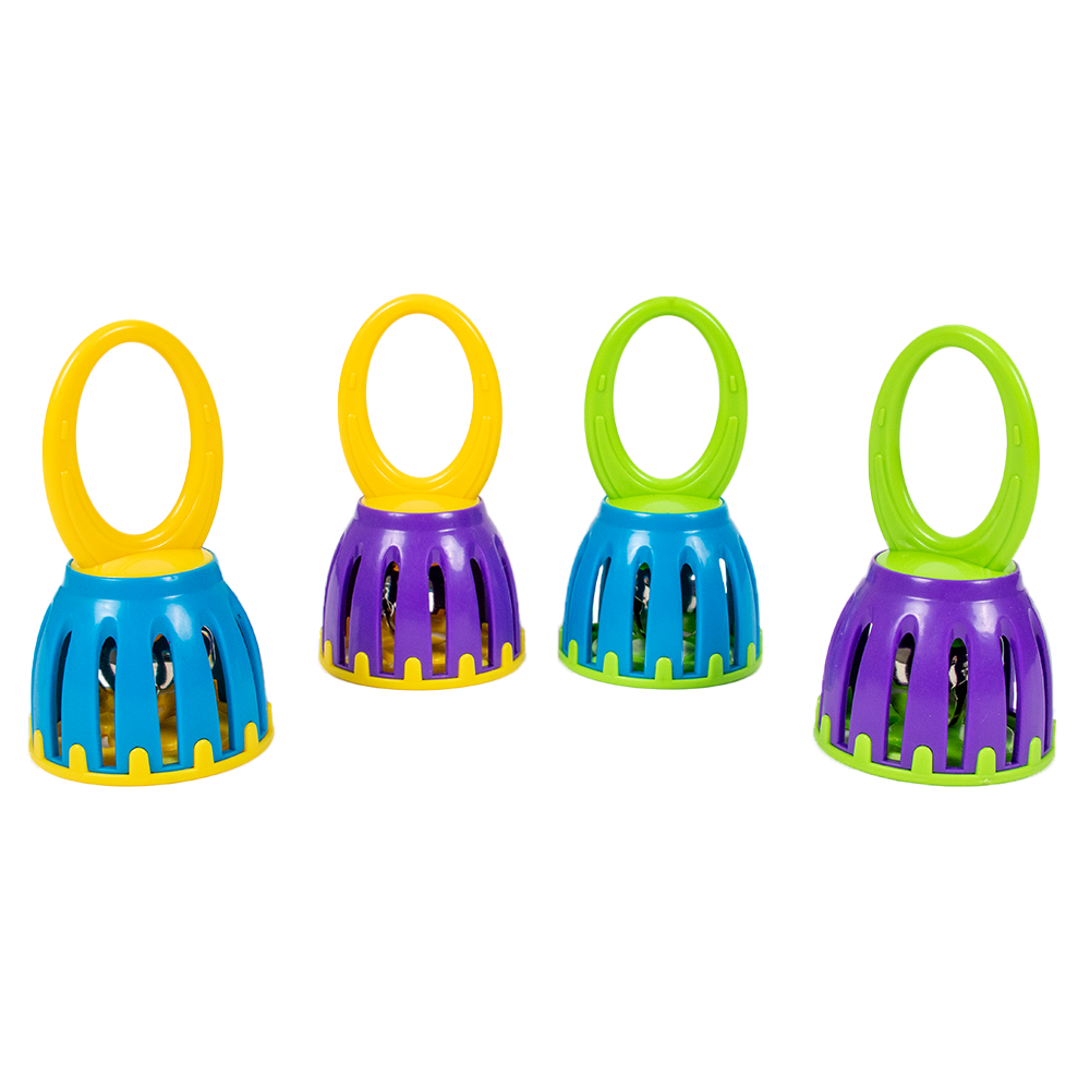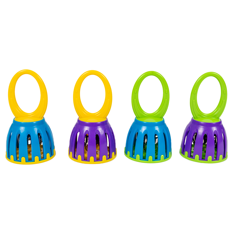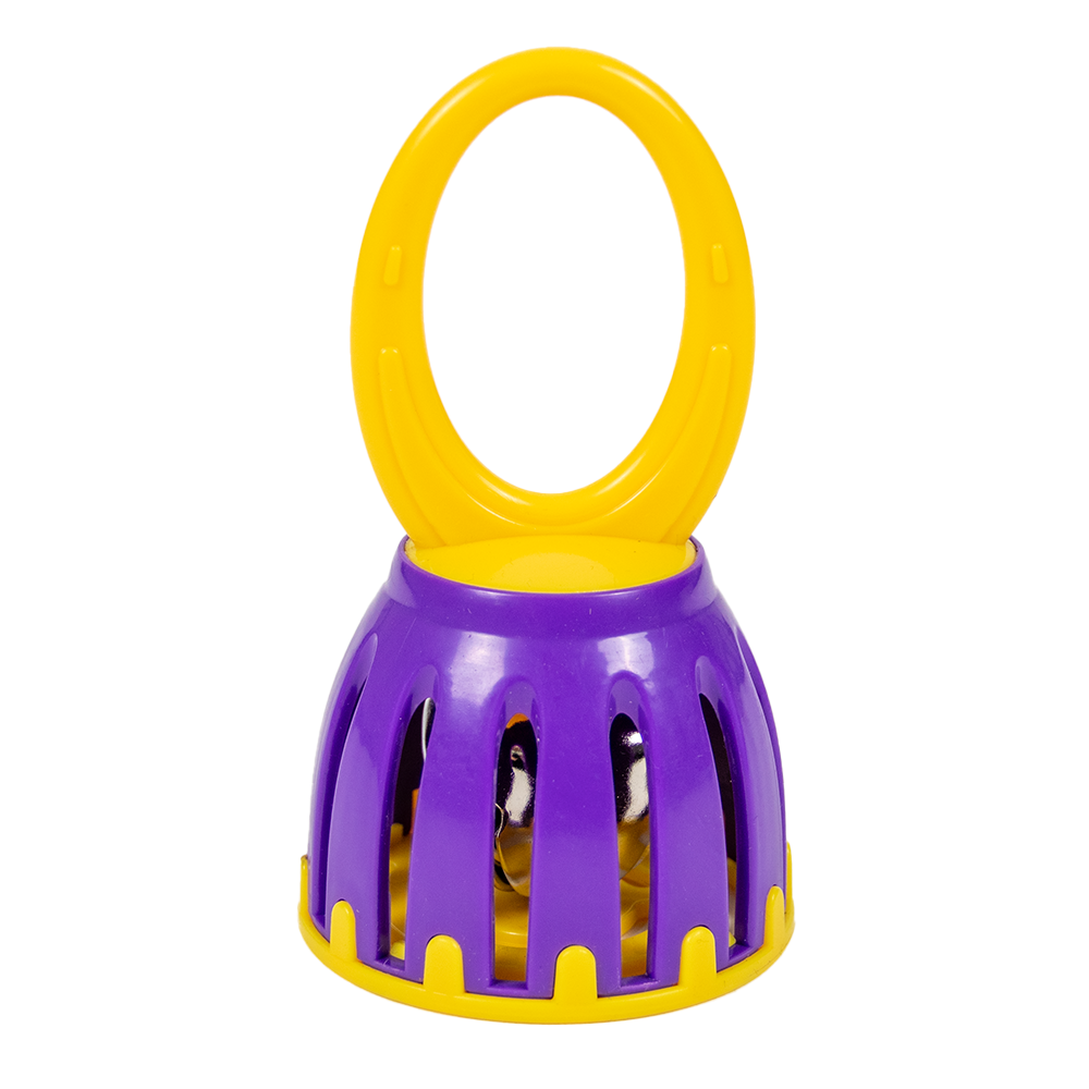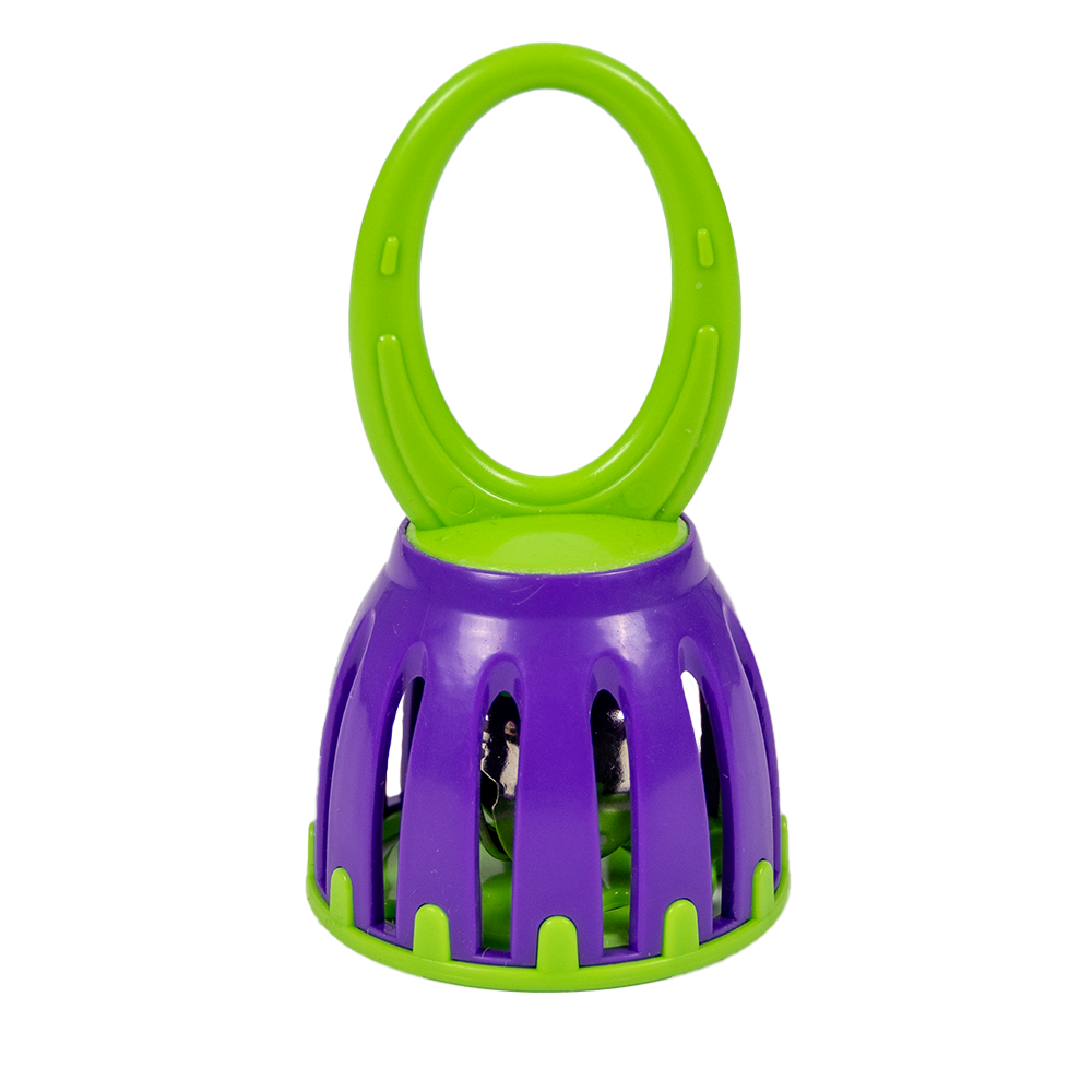 This adorable, bright bell is a favorite! The bells is fully enclosed for safety and the round handle makes it easy for small children to hold.