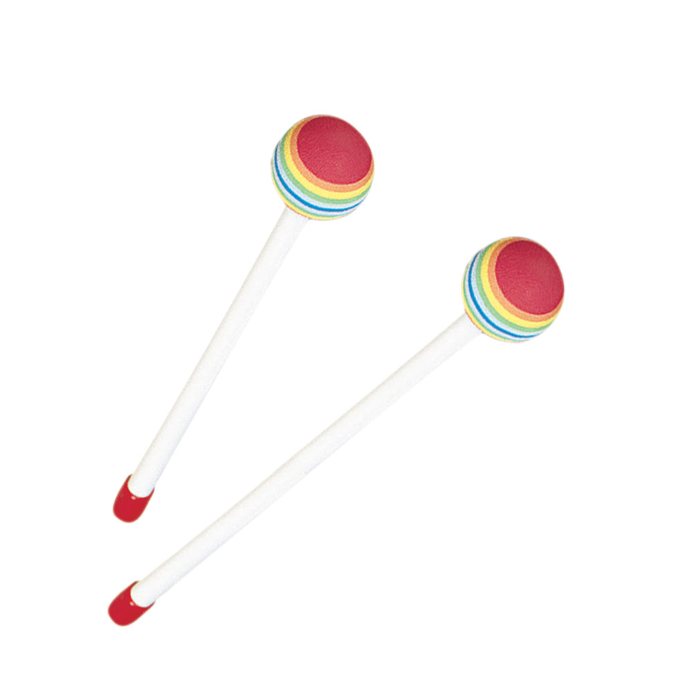 These mallets have a foam rainbow striped head, with a white plastic shaft, and red plastic capped end. They come in either 8″ or 10″ length. Sold individually.