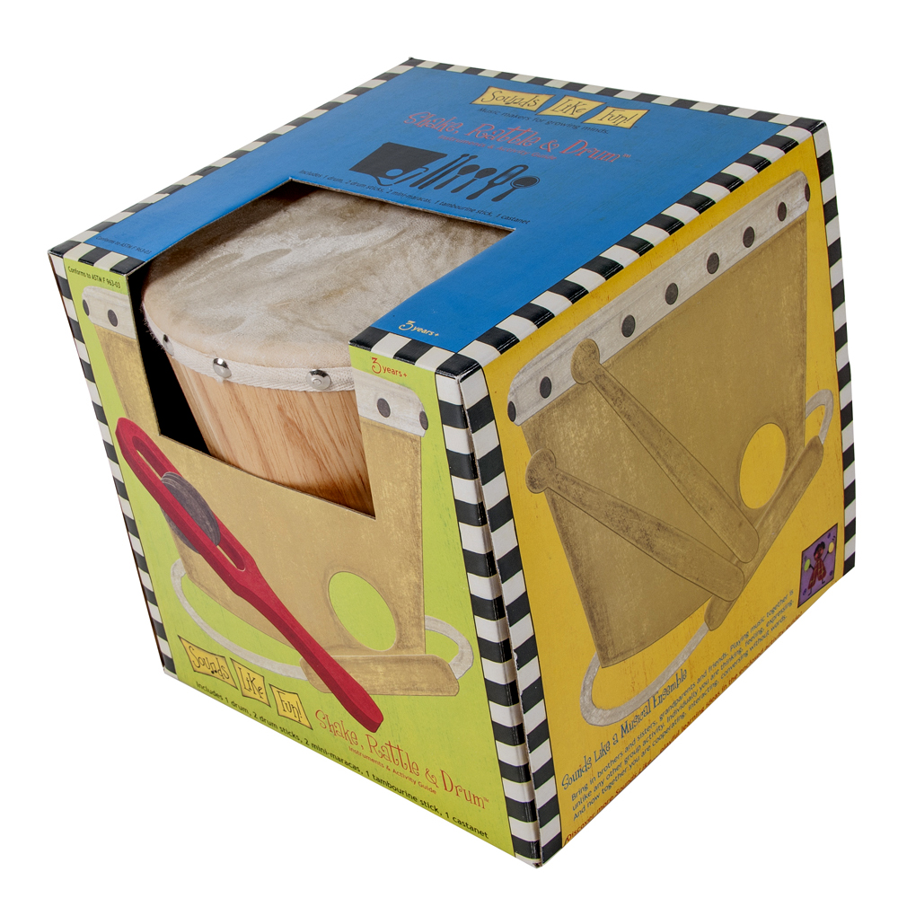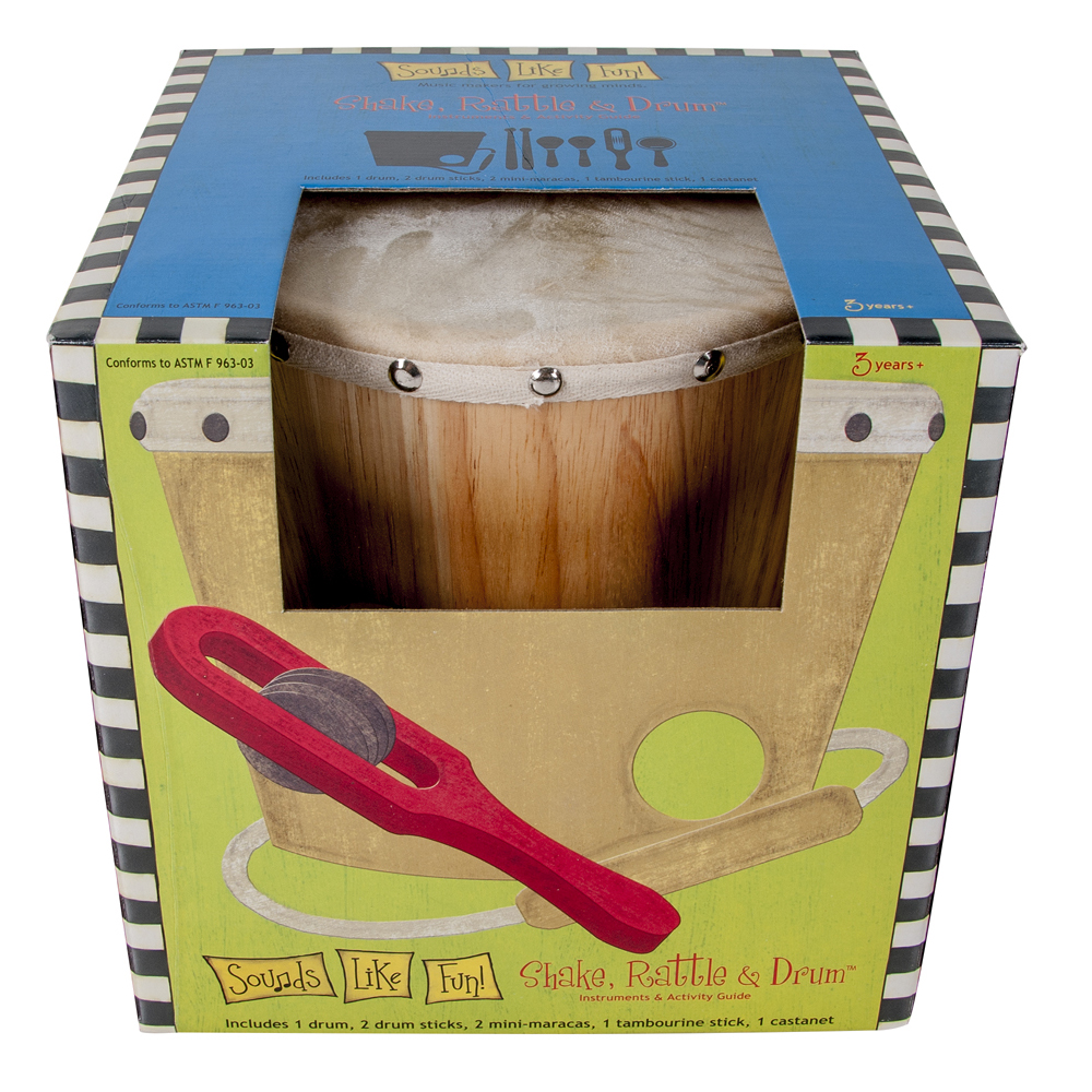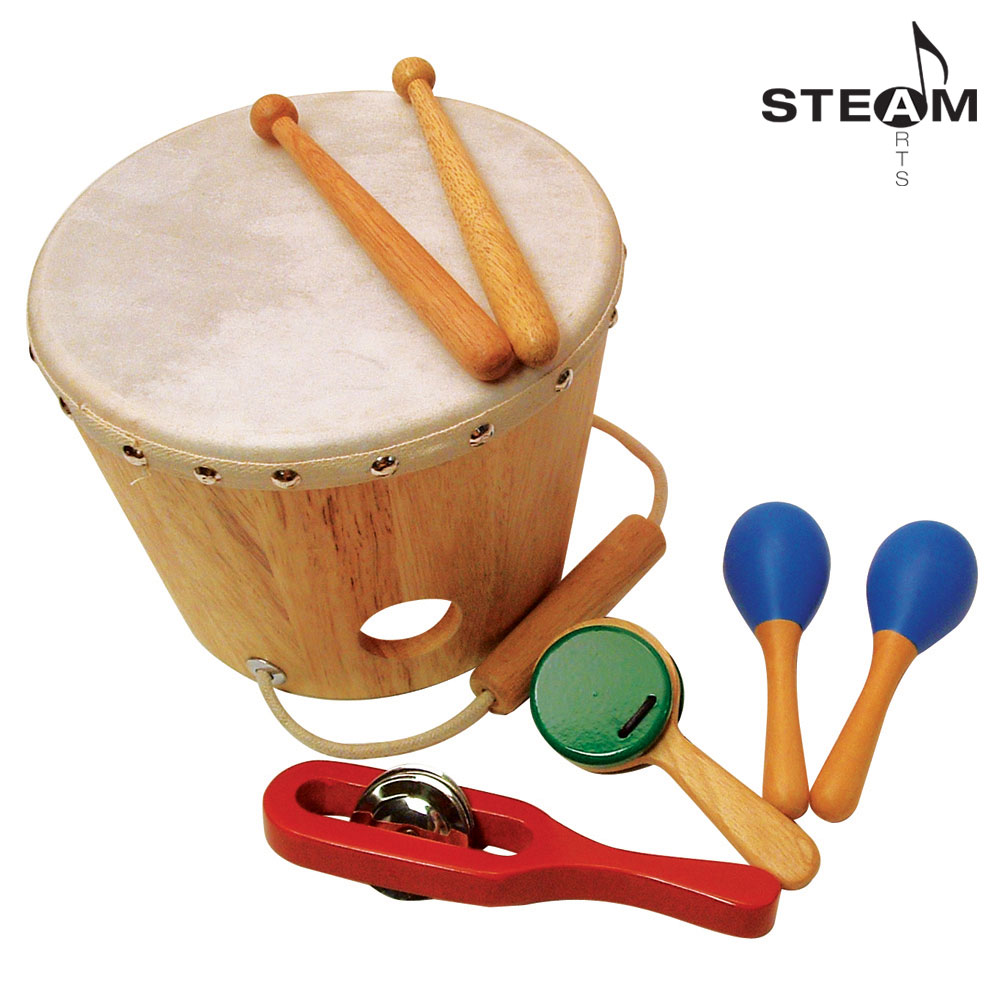 This handcrafted wood set includes 7 pieces: A bucket drum with a natural skin head, a pair of drum sticks, a single jingle stick, a handled castanet and a pair of mini maracas. Fun for the whole family or class! Includes a parent/teacher-friendly activity guide for ideas on using the items to encourage child development.