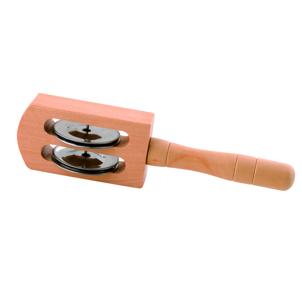 Two pairs of tambourine jingles in a wood case and attached to a wood handle. Jingles produce a delicate sound.